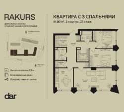 Продаётся 3-комнатная квартира 91.90 м² в жилом комплексе Ракурс. Квартиру отличают панорамное остекление, потолки 2,9 м, улучшенная шумо и воздухоизоляция. Дом сдаётся в 1 квартале 2028 года, продажи проходят через эскроусчета. Подземный паркинг, коворкинг, закрытая благоустроенная территория с фонтаном и артобъектами. Гибкие условия покупки.