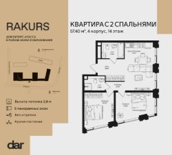 Продаётся 2-комнатная квартира 57.40 м² в жилом комплексе Ракурс. Квартиру отличают панорамное остекление, потолки 2,9 м, улучшенная шумо и воздухоизоляция. Дом сдаётся в 1 квартале 2028 года, продажи проходят через эскроусчета. Подземный паркинг, коворкинг, закрытая благоустроенная территория с фонтаном и артобъектами. Гибкие условия покупки.