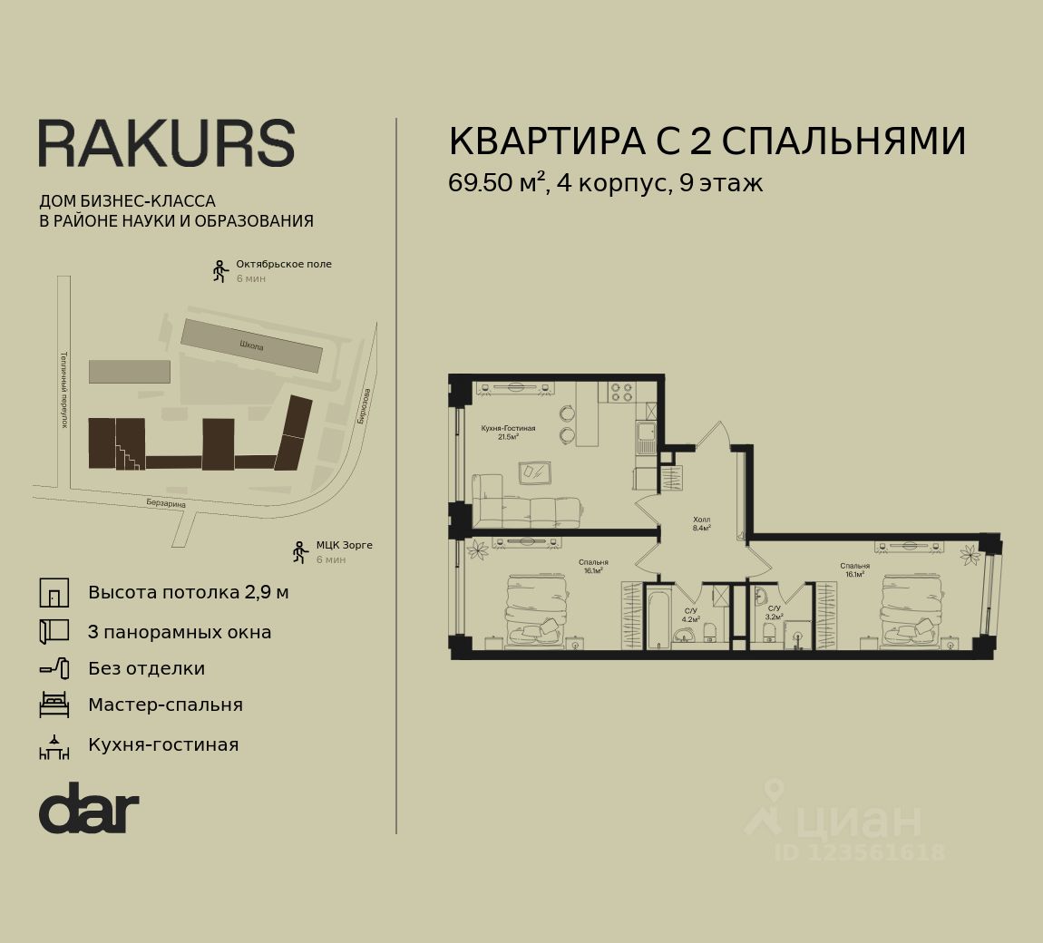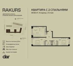 Продаётся 2-комнатная квартира 69.50 м² в жилом комплексе Ракурс. Квартиру отличают панорамное остекление, потолки 2,9 м, улучшенная шумо и воздухоизоляция. Дом сдаётся в 1 квартале 2028 года, продажи проходят через эскроусчета. Подземный паркинг, коворкинг, закрытая благоустроенная территория с фонтаном и артобъектами. Гибкие условия покупки.