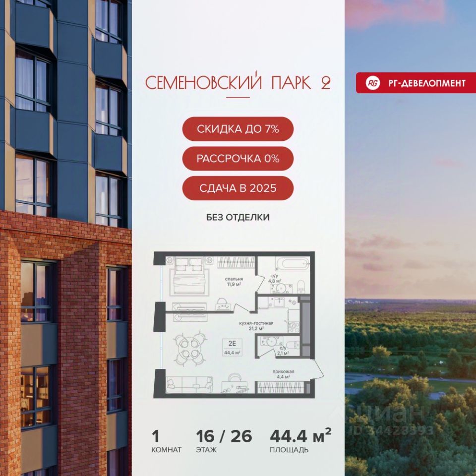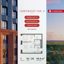 Продается 1-к квартира 44,4 кв.м. в ЖК "Семеновский парк 2" на 16-м этаже 26 этажного дома.
