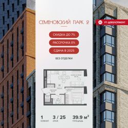 Продается 1-к квартира 39,9 кв.м. в ЖК "Семеновский парк 2" на 3-м этаже 25 этажного дома.