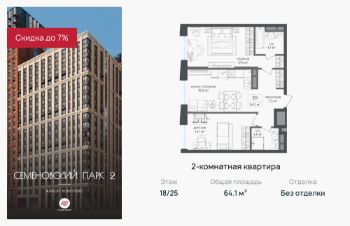 Продается 2-к квартира 64,1 кв.м. в ЖК "Семеновский парк 2" на 18-м этаже 25 этажного дома.