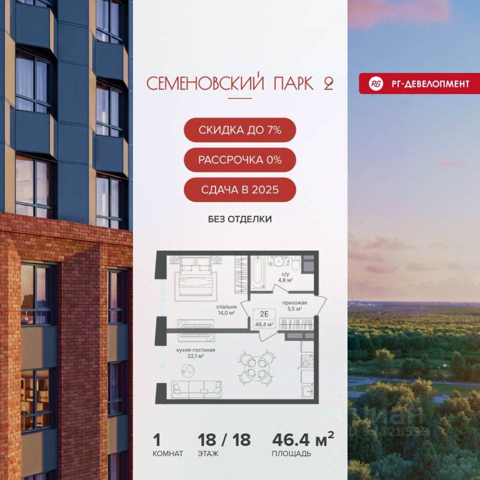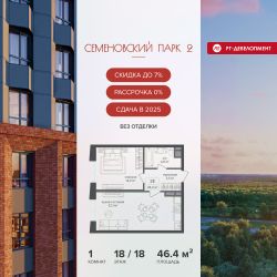 Продается 1-к квартира 46,4 кв.м. в ЖК "Семеновский парк 2" на 18-м этаже 18 этажного дома.