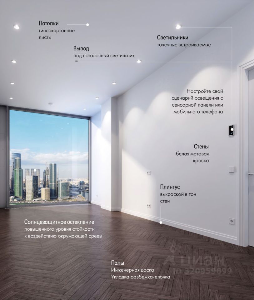 • Пол: гостиная зона, жилые комнаты — инженерная доска; санузел, кухня, коридор — керамогранит
