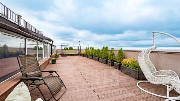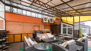 Роскошная терраса площадью 150 кв.м представлена открытой зоной отдыха с шезлонгами и зоной гостиной с барбекю под тентом от солнца и дождя, где Вам, Вашей семье и гостям в любую погоду будет приятно проводить время.
