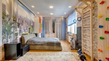Просторная, светлая гостиная — 40 кв.м, большая кухня-столовая — 37 кв.м, кабинет — 27,6 кв.м, мастер-спальня — 25,8 кв.м со своей ванной комнатой, две гардеробные комнаты, две детские спальни — 21 и 25 кв.м, детская ванная комната и гостевой санузел — расположены на первом уровне пентхауса. На втором уровне размещён кинозал или ещё одна спальня со своим санузлом с джакузи и душевой кабиной, а также малая кухня-гостиная с выходом на террасу.
