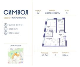 Продается новая Евро трехкомнатная квартира в ЖК бизнес-класса "Символ", квартал "Искренность". Квартира расположена на 5 этаже 14-этажного дома, общая площадь составляет 62,7 м2, окна квартиры выходят на парковую зону "Зеленая Река". Высота потолка - 3,3 метра, премиальная отделка от застройщика, сплит система фирмы LG, скрытые плинтуса, подогрев пола, межкомнатные двери invisible, кухонный гарнитур со встроенной бытовой техникой, инженерная доска, сантехника премиум-класса, декоративная подсветка.