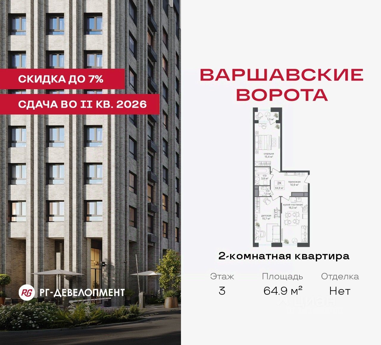 Продаётся 2-комнатная квартира 64.9 кв.м. в МФК "Варшавские ворота" на 3-м этаже 7 этажного дома. МФК "Варшавские ворота" — это точка баланса между природой и городом, стилем и функциональностью, жизнью сегодня и устойчивым будущим.