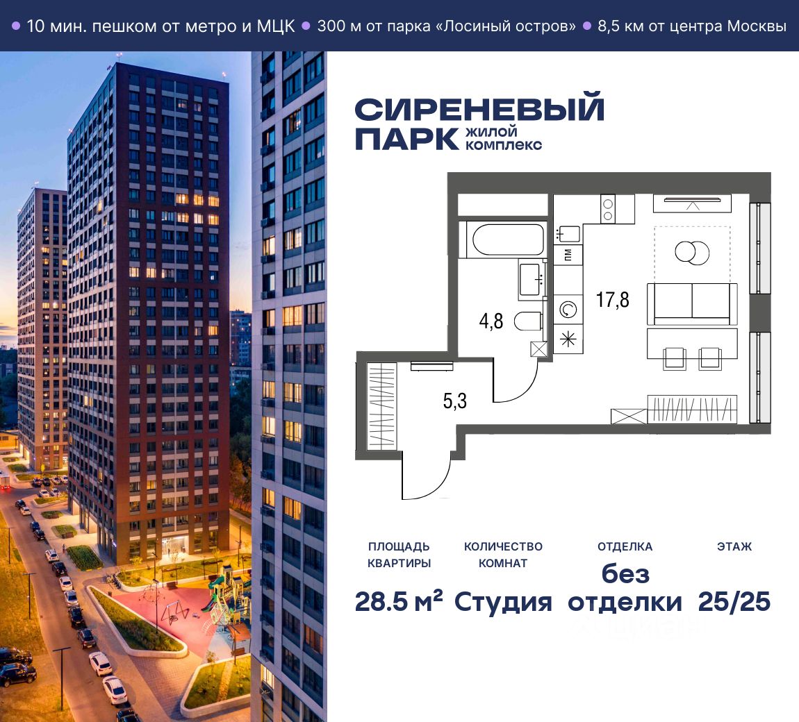 Продаётся просторная студия общей площадью 28.5 м² на 25 этаже в новом жилом комплексе "Сиреневый парк", расположенном в Восточном административном округе Москвы на улице Тагильская. Всего 10 минут ходьбы от станции метро "Бульвар Рокоссовского" и одноимённой платформы МЦК.
