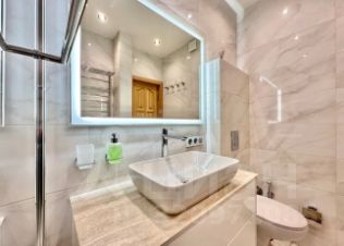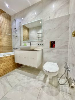 * Свежий ремонт в ванной комнате: Наслаждайтесь современным дизайном и качественной сантехникой (инсталляция Grohe, краны Grohe).