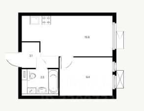 Планировка предусматривает большую кухню-гостиную, спальню, санузел и прихожуюс готовой нишей под встроенный шкаф.