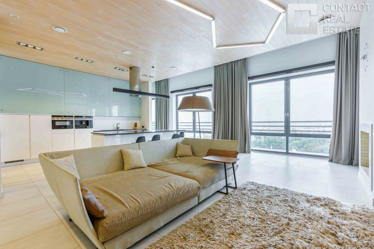 Функциональная планировка предусматривает: кухню-гостиную, 2 спальни и 2 санузла, удобную прихожую с вместительным гардеробом. Выполнена дизайнерская отделка в минималистичном стиле. Квартира очень светлая и просторная, в том числе благодаря панорамным окнам и высоким 4-метровым потолкам.