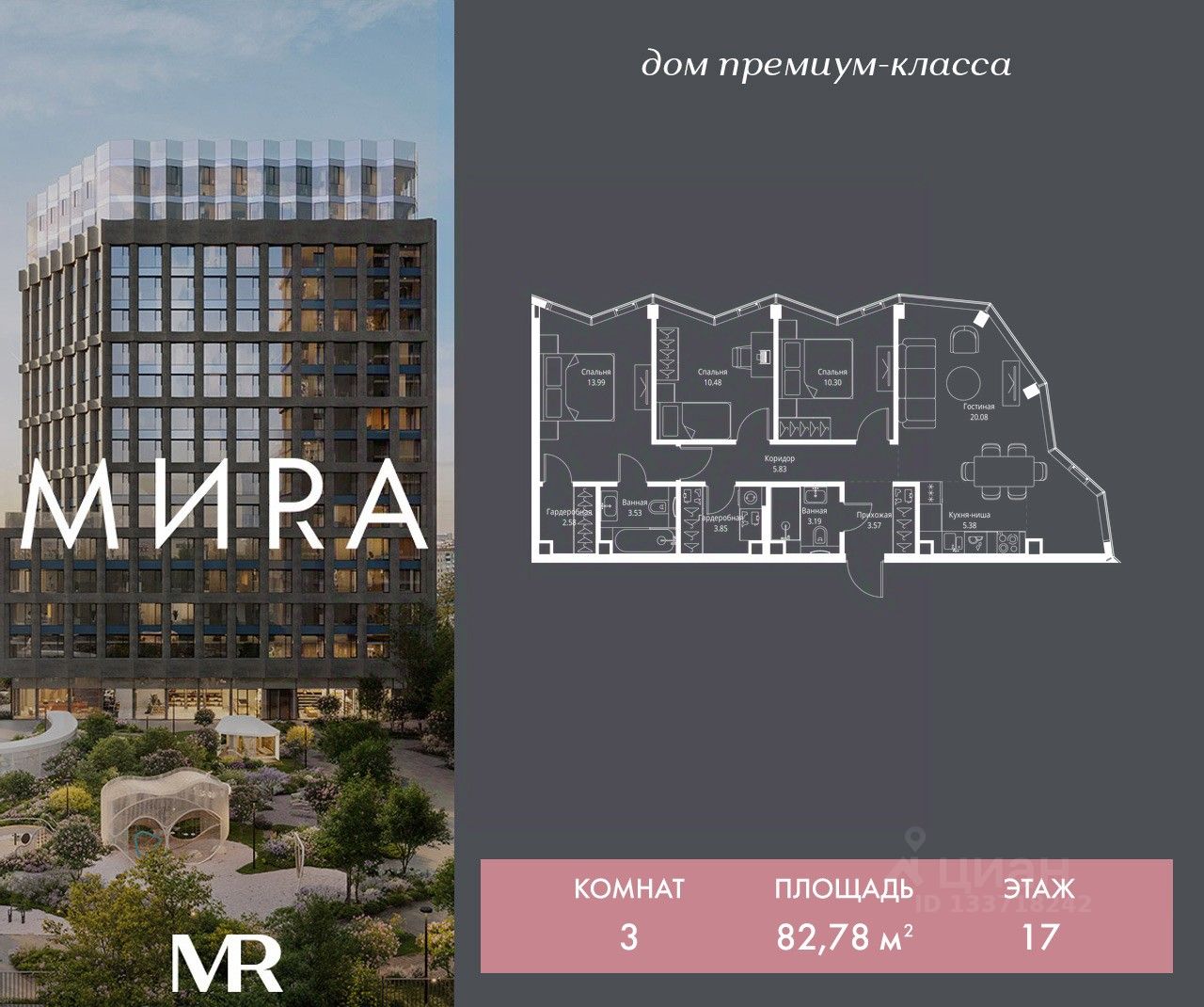 Продаётся 3-комнатная квартира общей площадью 82.78 м² без отделки в доме премиум-класса МИRА на 17-м этаже 17 этажного дома. Квартира расположена в корпусе 1.