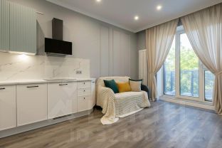 Планировка: кухня-гостиная с французским балконом, спальня, санузел с душем, гардеробная.