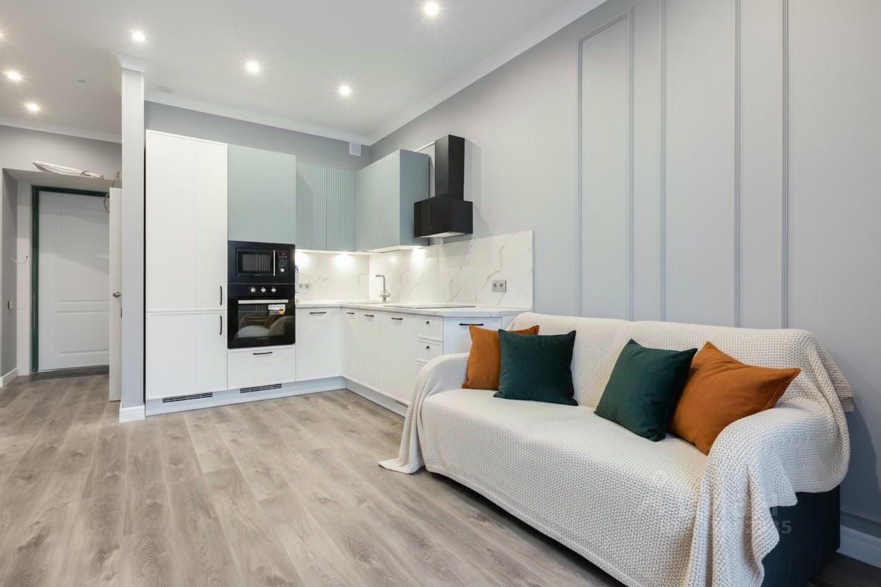Выполнена светлая отделка - стены окрашены, на полу износостойкое кварц-вениловое покрытие. Благодаря панорамным окна пространство наполнено светом.