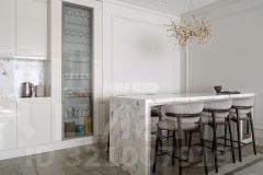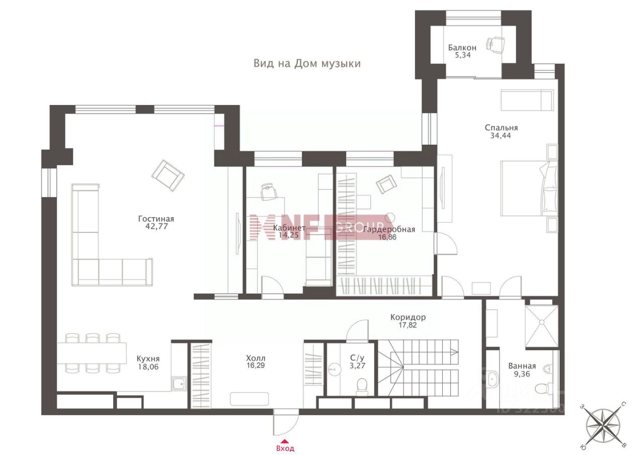 Планировка: гостиная-столовая с зоной кухни, мастер-спальня с ванной, гардеробной и выходом на балкон, кабинет или дополнительная спальня, гостевой санузел.