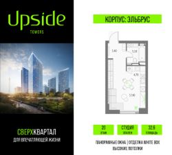 Продаётся студия площадью 32.6 кв.м на 20 этаже 55 этажного корпуса Эльбрус в квартале небоскребов "Upside Towers". В квартире отделка White-box, c видом на внутренний двор, прогулочный бульвар, 2 очередь. Номер квартиры А2008.