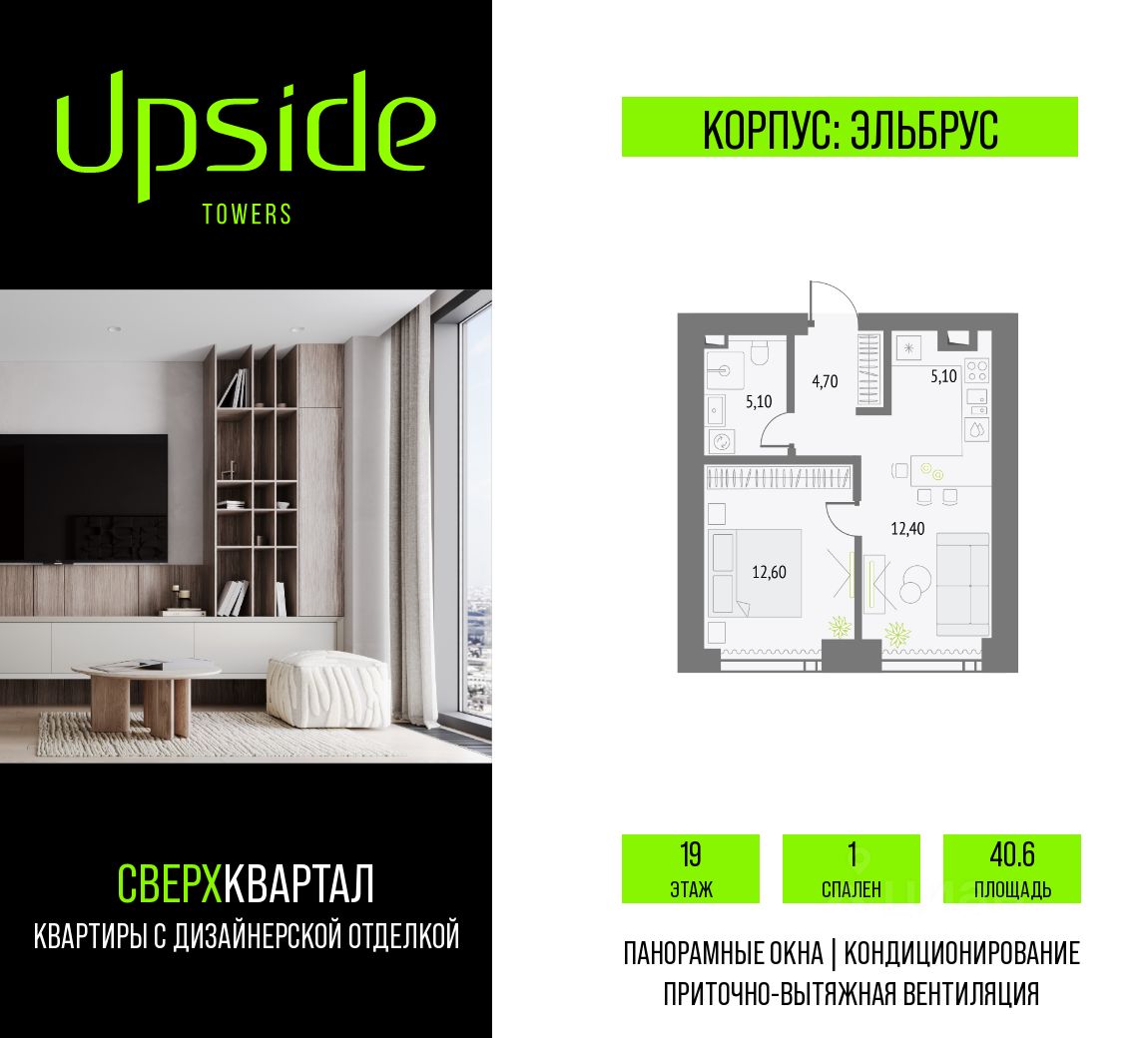 Продаётся 1-комнатная квартира площадью 40.6 кв.м на 20 этаже 55 этажного корпуса Эльбрус в квартале небоскребов "Upside Towers". В квартире отделка White-box, c видом . Номер квартиры А2012.