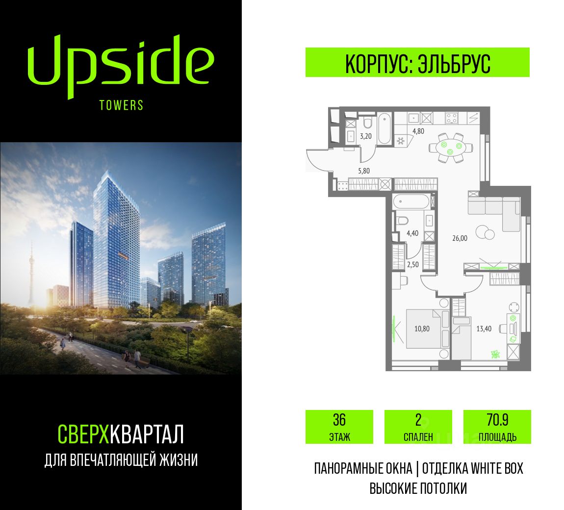 Upside Towers - технологичный квартал строится в динамично развивающемся Бутырском районе, в 3 мин. от метро, в 5 мин. от ТТК. На территории 7 га возводится 5 высотных башен от 19 до 58 этажей, названных в честь главных вершин земли. Квартиры с панорамными окнами в пол, высокими потолками и современными инженерными решениями. Благоустроенная зеленая территория включает: приватные дворы, природный комплекс, прогулочный бульвар, ландшафтный парк 2,5 га с сенсорным садом и многофункциональными игровыми и спортивными площадками.