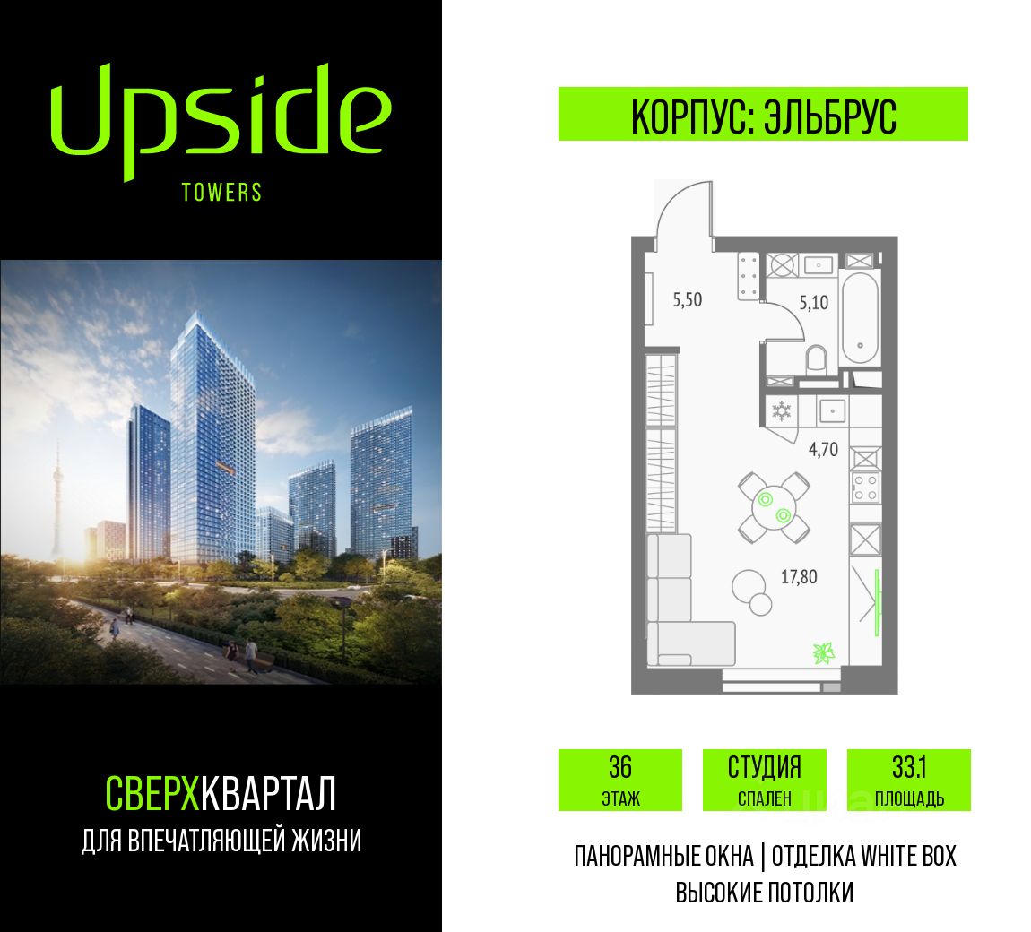 Upside Towers - технологичный квартал строится в динамично развивающемся Бутырском районе, в 3 мин. от метро, в 5 мин. от ТТК. На территории 7 га возводится 5 высотных башен от 19 до 58 этажей, названных в честь главных вершин земли. Квартиры с панорамными окнами в пол, высокими потолками и современными инженерными решениями. Благоустроенная зеленая территория включает: приватные дворы, природный комплекс, прогулочный бульвар, ландшафтный парк 2,5 га с сенсорным садом и многофункциональными игровыми и спортивными площадками.