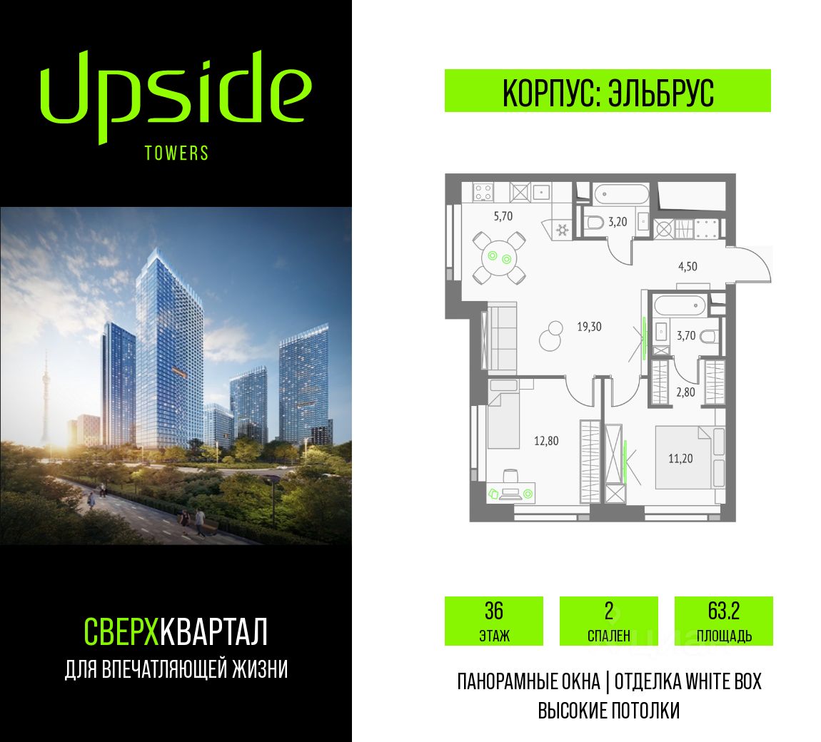 Продаётся 2-комнатная квартира площадью 63.2 кв.м на 36 этаже 55 этажного корпуса Эльбрус в квартале небоскребов "Upside Towers". В квартире отделка White-box, c видом . Номер квартиры А3615.