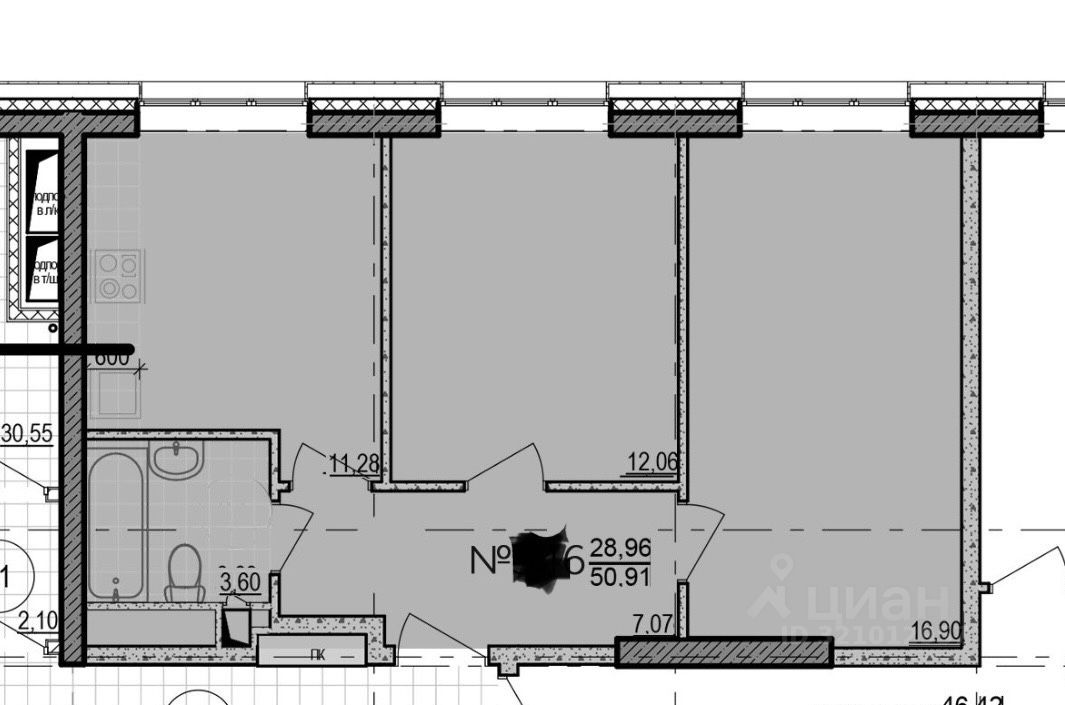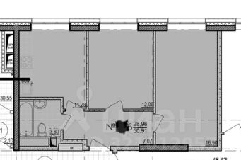 - Площадь: 50,9 кв. м (жилая 28,9 кв. м, кухня 11,2 кв. м)