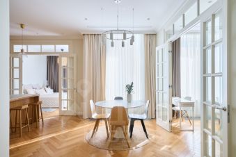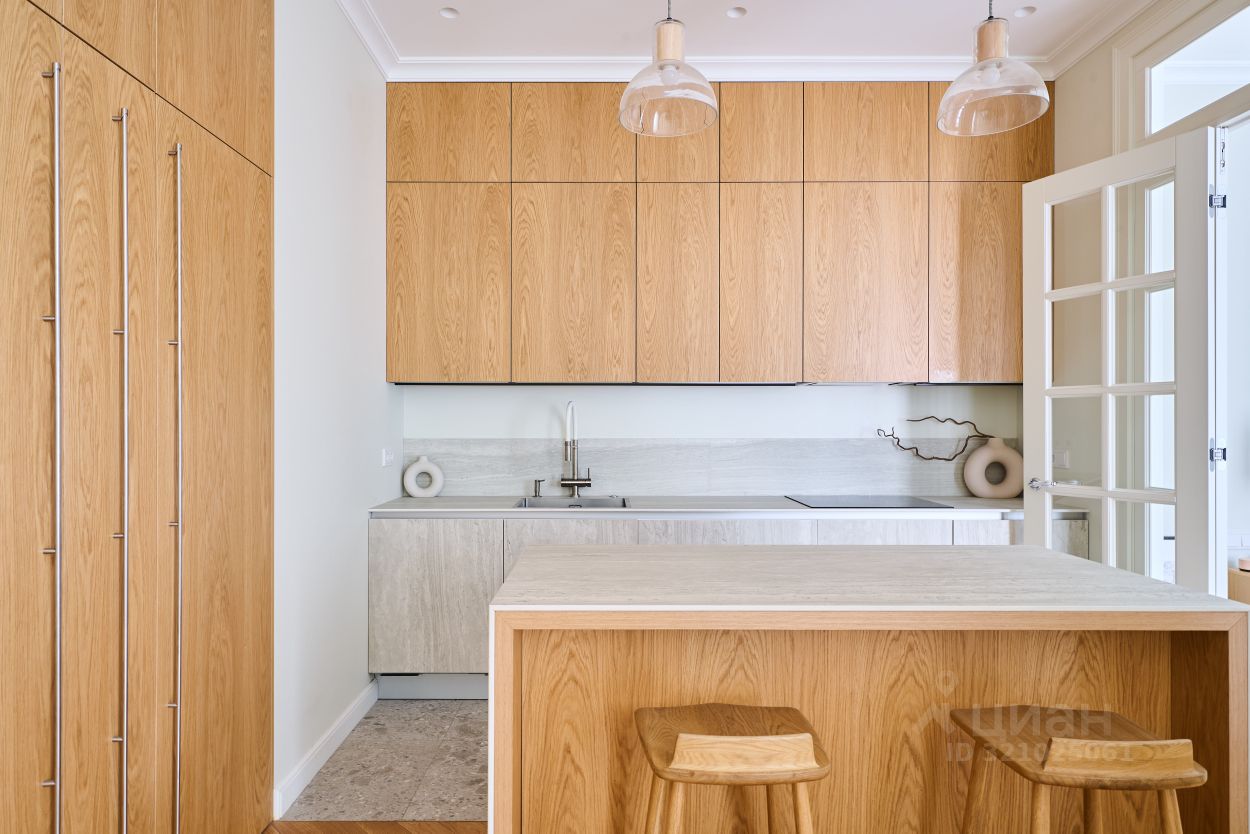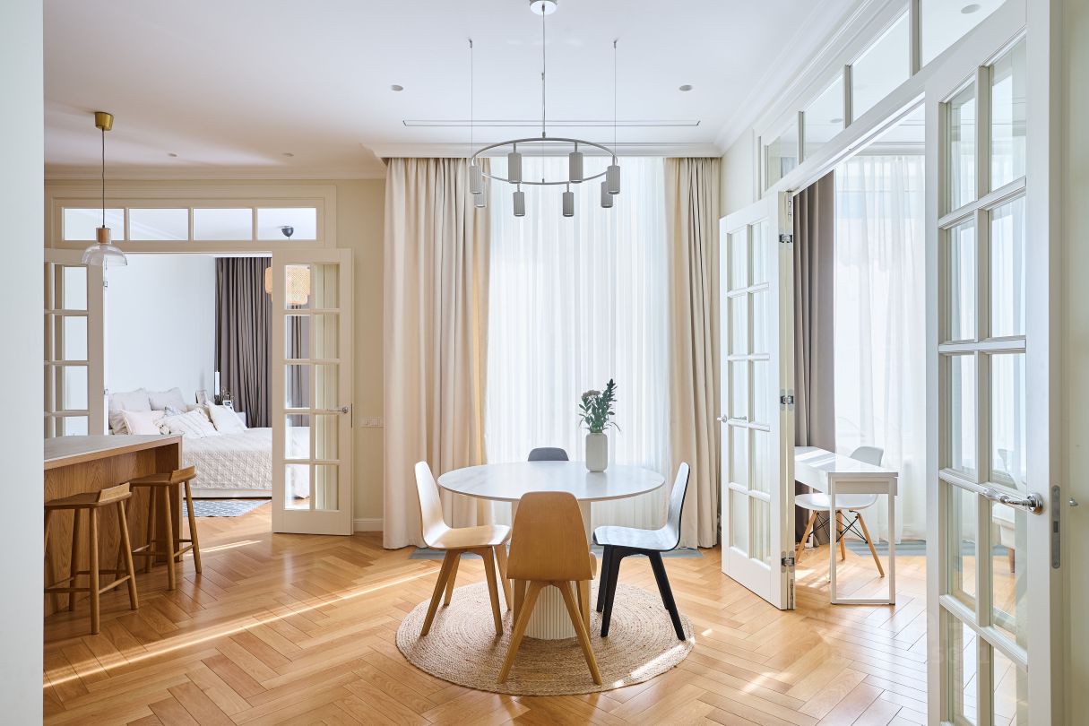 Интерьер в мягких теплых природных тонах добавляет ощущение уюта и утонченности. Изящное планировочное решение - анфилада комнат - визуально расширяет пространство, а высокие потолки 3м и панорамные деревянные окна на юг и юго-запад наполняют его естественным светом.