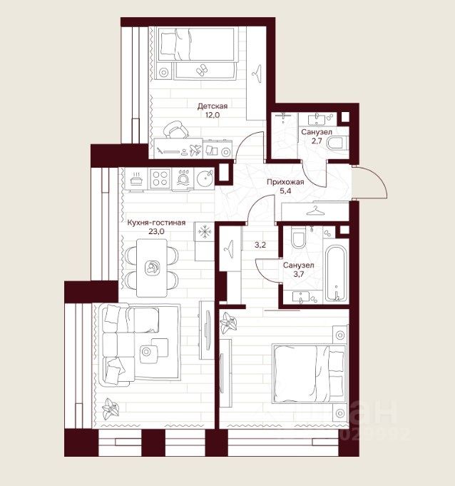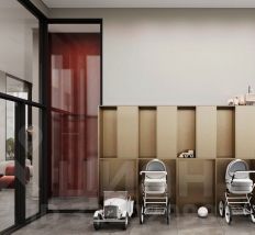 Квартира располагается на 11 этаже. Планировка предполагает свободное пространство, условно разделенное на зону кухни и зону для отдыха.