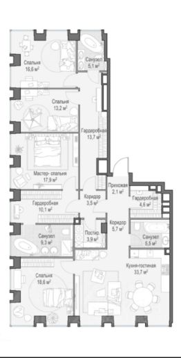 В квартире можно разместить просторную кухню-гостиную, мастер-спальню с собственной ванной комнатой и гардеробной, 3 спальни, 2 санузла, две гардеробные, постирочную и холл. На фотографии представлено возможное планировочное решение.