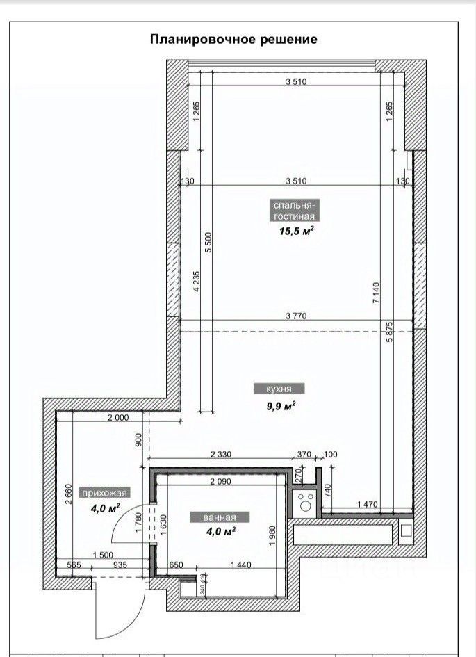Общая площадь - 33,4 кв.м. Комната-студия 25,4 кв.м. (зона жилой комнаты 15,5; зона кухни 9,9). Санузел - 4 кв.м. Коридор (прихожая) - 4 кв.м.