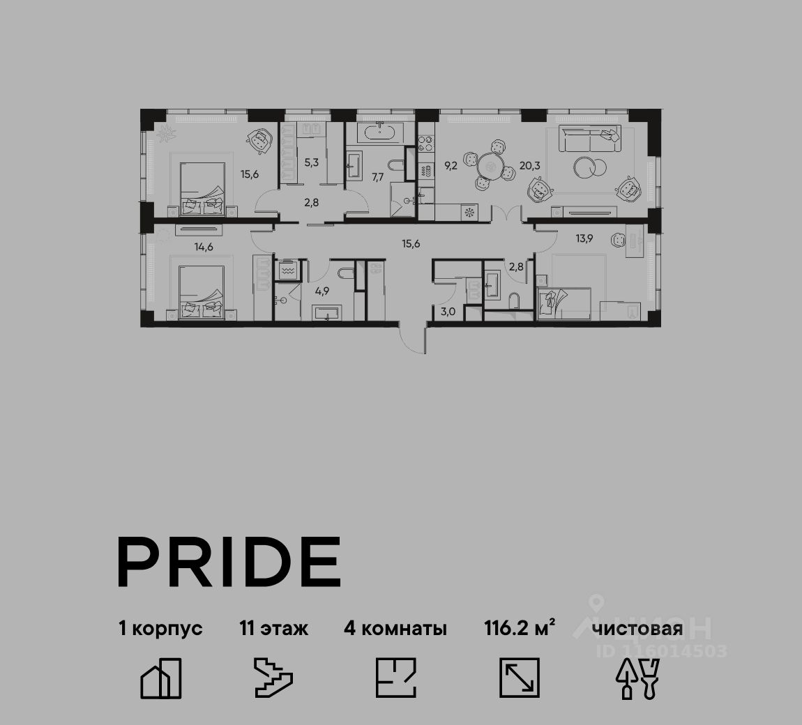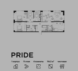 В премиальном жилом квартале PRIDE продается 4-комнатная квартира в 1 корпусе, на 11 этаже, в секции 9. Её общая площадь составляет 116.2 м². Пространство включает 3 уютные спальни 13,9 м², 14,6 м², 15,8 м², просторную кухню-гостиную 29,5 м² и 2 ванные комнаты 7,9 м² и 5 м². В квартире будет выполнена дизайнерская отделка, представленная двумя стилистическими решениями на выбор. Ключи в 2026 году.