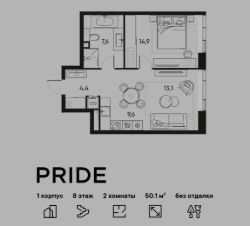 В премиальном жилом квартале PRIDE продается 2-комнатная квартира в 1 корпусе, на 8 этаже, в секции 3. Её общая площадь составляет 50.1 м². Пространство включает 1 уютную спальню 14,4 м², просторную кухню-гостиную 22,7 м² и ванную комнату 7,6 м².