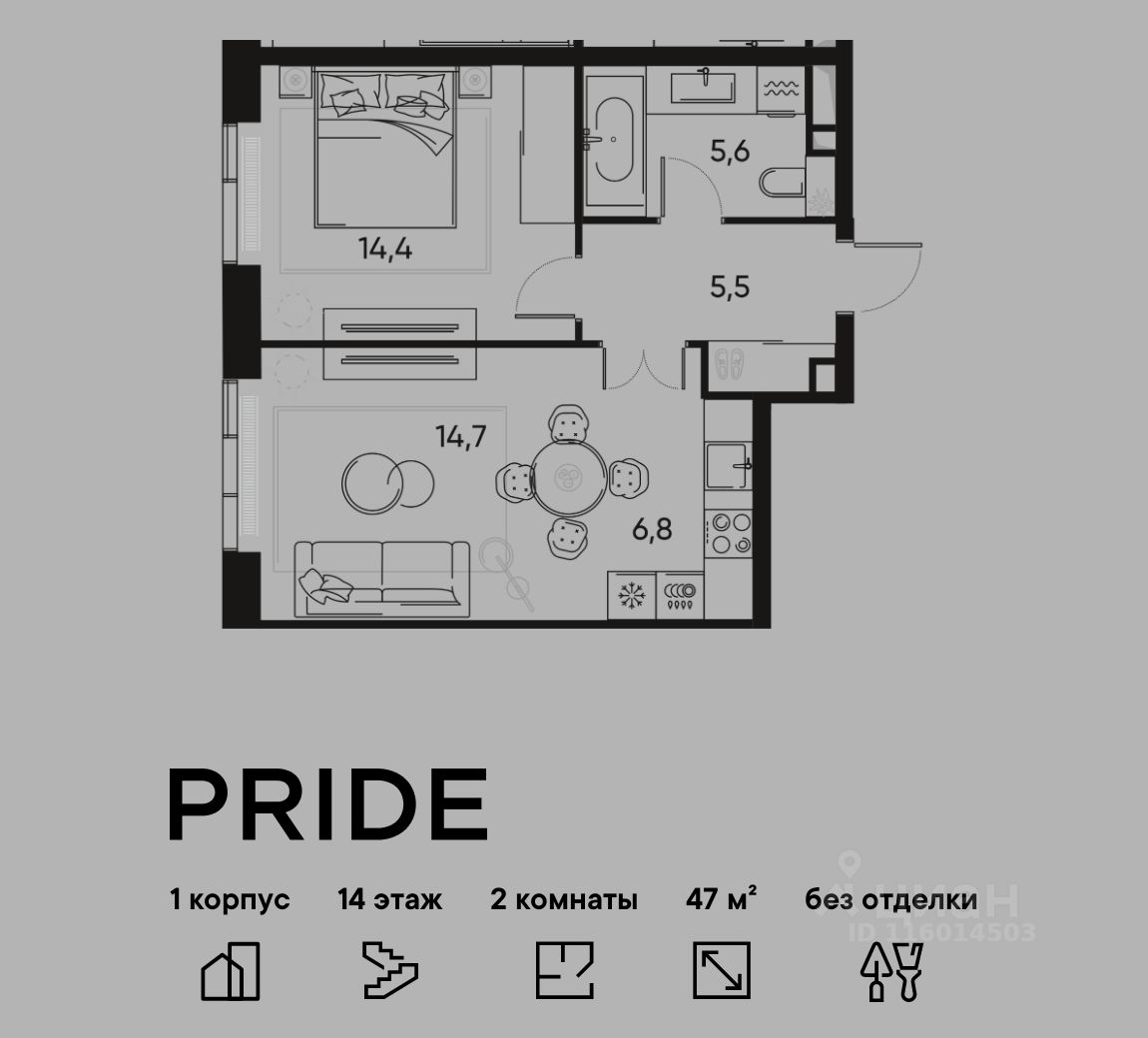 В премиальном жилом квартале PRIDE продается 2-комнатная квартира в 1 корпусе, на 14 этаже, в секции 3. Её общая площадь составляет 47 м². Пространство включает 1 уютную спальню 14,4 м², просторную кухню-гостиную 21,5 м² и ванную комнату 5,6 м².