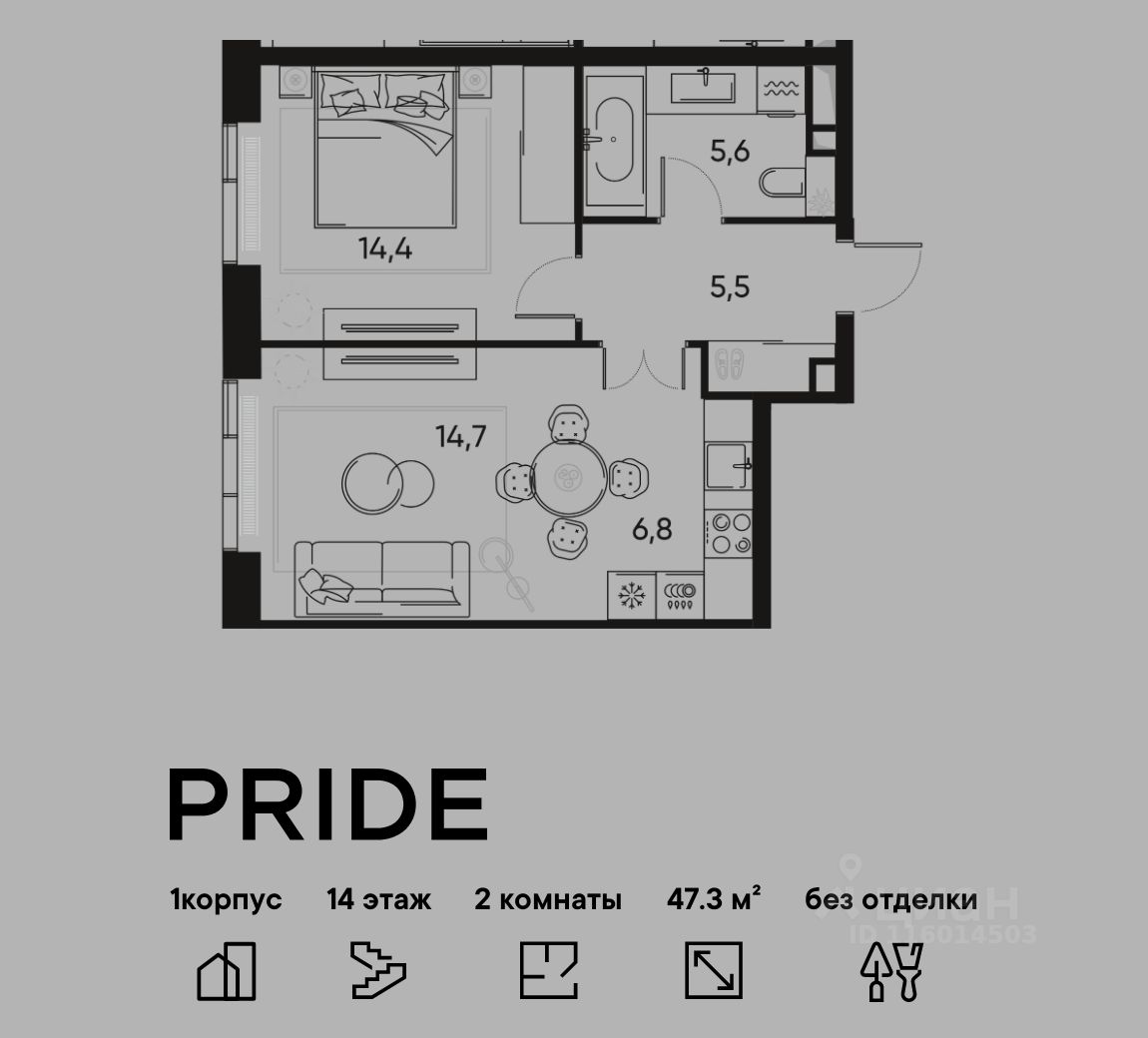 В премиальном жилом квартале PRIDE продается 2-комнатная квартира в 1 корпусе, на 14 этаже, в секции 3. Её общая площадь составляет 47.3 м². Пространство включает 1 уютную спальню 14,4 м², просторную кухню-гостиную 21,5 м² и ванную комнату 5,6 м². Ключи в 2026 году.