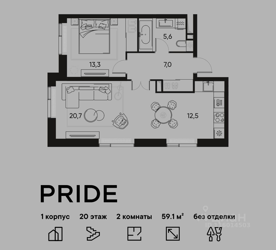 В премиальном жилом квартале PRIDE продается 2-комнатная квартира в 1 корпусе, на 20 этаже, в секции 3. Её общая площадь составляет 59.1 м². Пространство включает 1 уютную спальню 13,3 м², просторную кухню-гостиную 32,5 м² и ванную комнату 5,6 м².