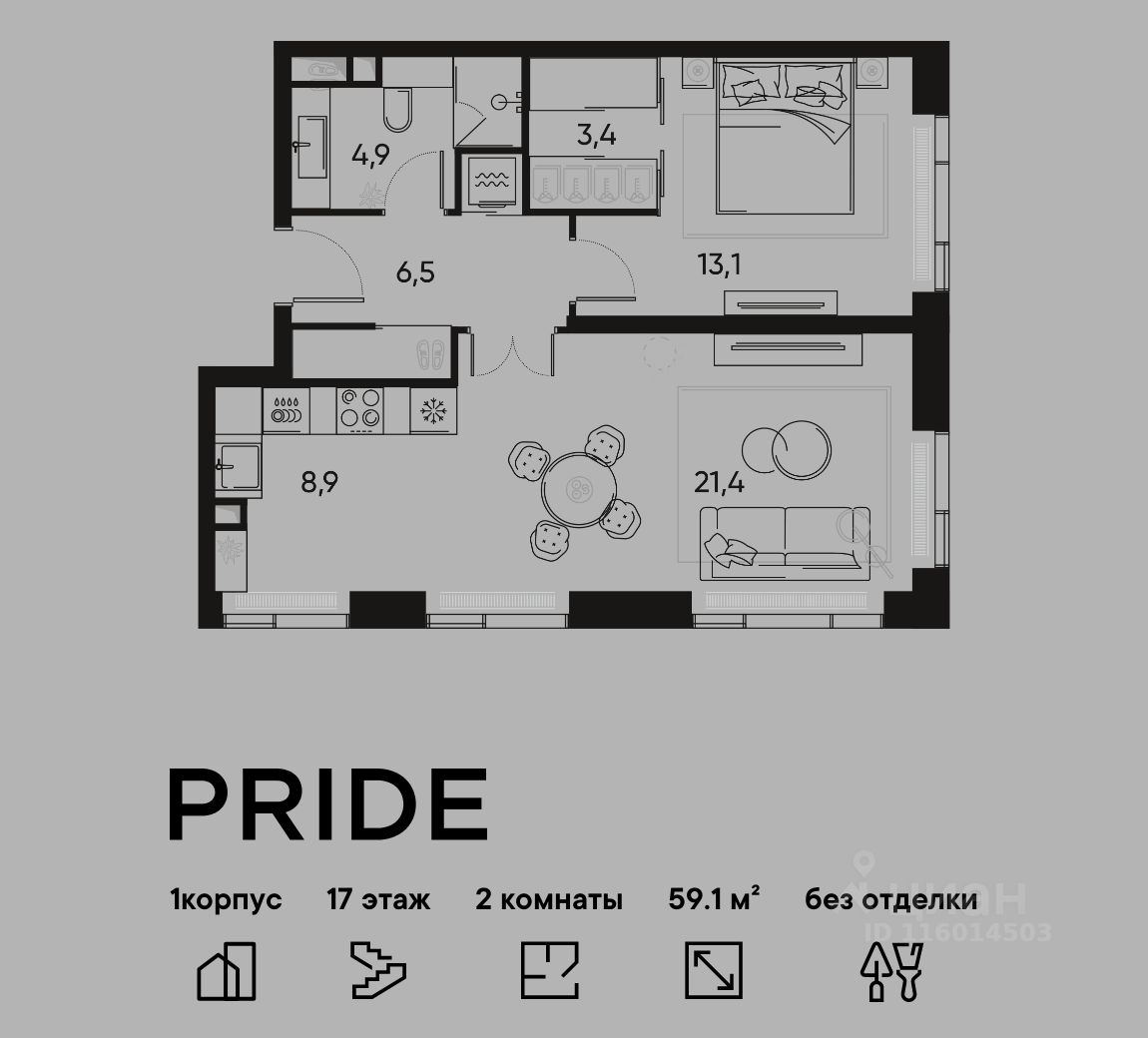 В премиальном жилом квартале Прайд продается 2-комнатная квартира в 1 корпусе, на 17 этаже, в секции 6. Её общая площадь составляет 59.1 м². Пространство включает 1 уютную спальню 13,1 м², просторную кухню-гостиную 30,3 м² и ванную комнату 4,9 м². Ключи в 2026 году.