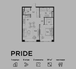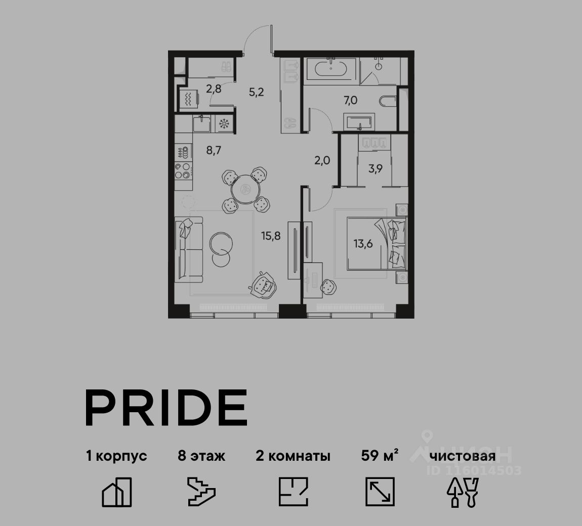 В премиальном жилом квартале PRIDE продается 2-комнатная квартира в 1 корпусе, на 8 этаже, в секции 7. Её общая площадь составляет 59 м². Пространство включает 1 уютную спальню 13,6 м², просторную кухню-гостиную 24,5 м² и ванную комнату 7 м². В квартире будет выполнена дизайнерская отделка, представленная двумя стилистическими решениями на выбор. Ключи в 2026 году.