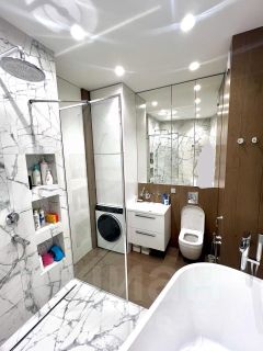 ЖК Невский (Адмирала Макарова 6А) Настоящий Бизнес-класс: огромная зеленая территория с благоустройством, (лучший корпус, в след уже началось импортозамещение), скоростные бесшумные лифты Schindler, центральное кондиционирование внешнего блока Electrolux, стильные лобби с консьержем, многоступенчатая пропускная система, подъезд всего 16 этажей. 52,4м2 общая площадь евродвушка, 27м2 кухня-гостиная, 13м2 спальня, 6,5м2 с/у. Новый ремонт. Полы: инженерная доска дуб, двери в потолок натур шпон, теневой плинтус, широкоформатный керамогранит, дорогостоящие отделочные материалы и мебель (вся корпусная на заказ до потолка), деревянные окна. Дорогая сантехника Kludi, Keuco, Viega. Шумоизоляция потолка, стен, пола. Высокие потолки 3,1м, Лучевая разводка отопления Rehau с гребенкой, также гребенка на воду, все необходимое оборудование, есть возможность установить сушильную машину в колонну по желанию, теплые полы. Панорама на город вдали от шума и дорог, восточная сторона. О местоположении: 500м м. Водный стадион, 1км МЦК Балтийская и ТЦ Метрополис лучший в Москве. В пешем доступе замечательные парки: Покрово-Стрешнево, Головинские пруды, Дружба, Речной вокзал. Район утопает в зелени. Один взрослый собственник, прямая продажа, полная стоимость в договоре, риелторам просьба беспокоить при наличии покупателя. Предметный ТОРГ уместен. В продаже также машиноместо и кладовая отдельно. Просьба: если не дозвонились, оставьте сообщение, я сама свяжусь.