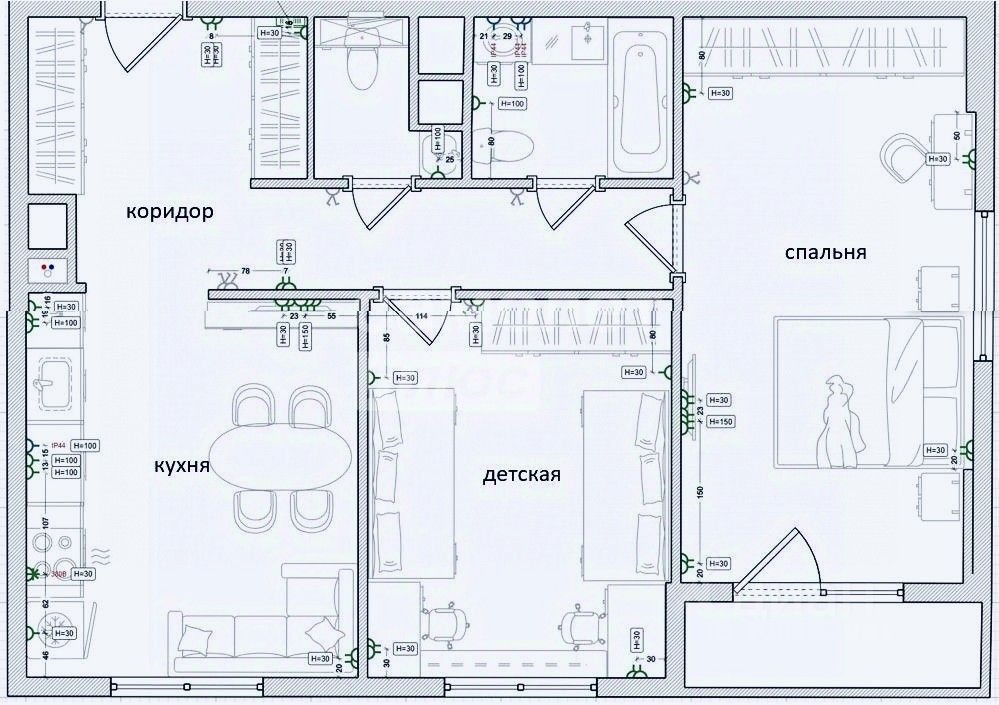 Планировка: уютная кухня-гостиная с обеденной зоной и местом отдыха, просторная спальня с рабочим местом и выходом на балкон с панорамным остеклением, спальня, возможно для вашего ребенка, ванная комната, два санузла.