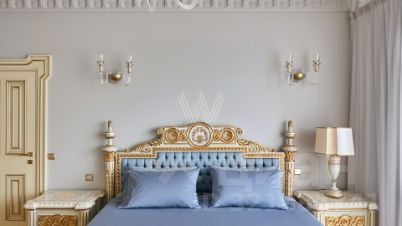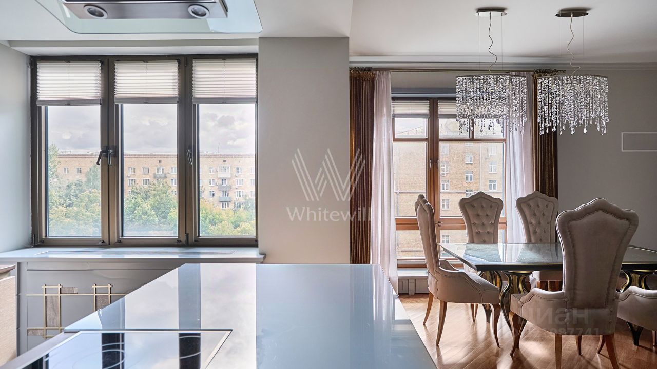 Планировка включает кухню-гостиную с обеденной зоной, две спальни, кабинет либо третью спальню, два санузла и вместительную гардеробную. Квартира укомплектована итальянской мебелью и техникой Miele. Установлена система центрального кондиционирования.