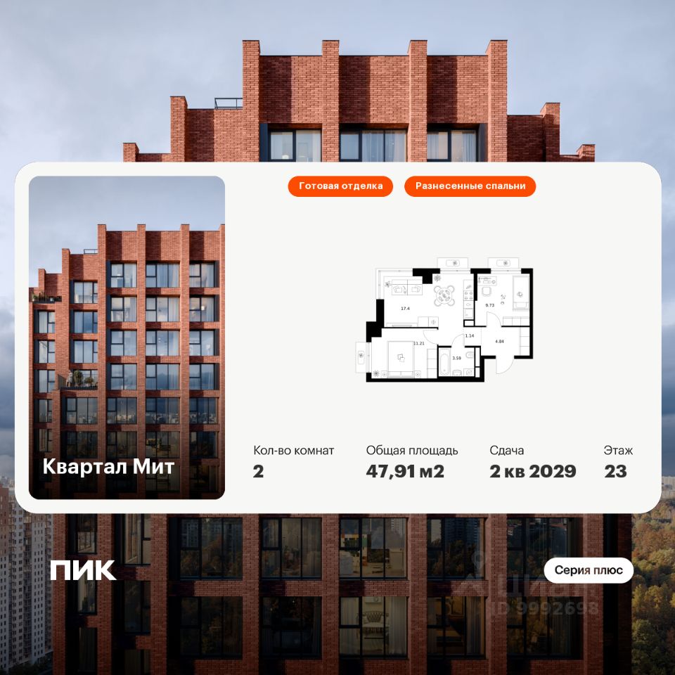 Новостройка! Продается 2-комн. кв-ра площадью 47,91 кв.м, (Корпус 3.2, Секция 2) 23 этаж 26-этажного дома в Квартал Мит от ПИК. "Квартал Мит" строится в экологически чистом районе Митино, где по соседству расположен большой лесопарк, а с двух сторон протекают реки Сходня и Журавка. Для семей с детьми здесь появится школа и два детских сада.