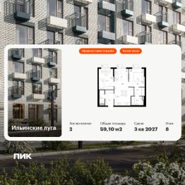 Продаётся 2-комн. квартира площадью 59,1 кв.м на 8 этаже 9 этажного дома (Корпус 4.3, Секция 3) проекта ПИК Ильинские луга. Светлый просторный подъезд на уровне земли, функциональная планировка, большие окна, предчистовая отделка.
