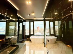 Подоконники из гранита, немецкие окна с термоблоками, использованы краски премиум-сегмента Flugger и Clark Kensington. Сантехника Laufen и Duravit. В квартире встроена система умного дома. Мебель в санузлах создана по индивидуальному заказу.