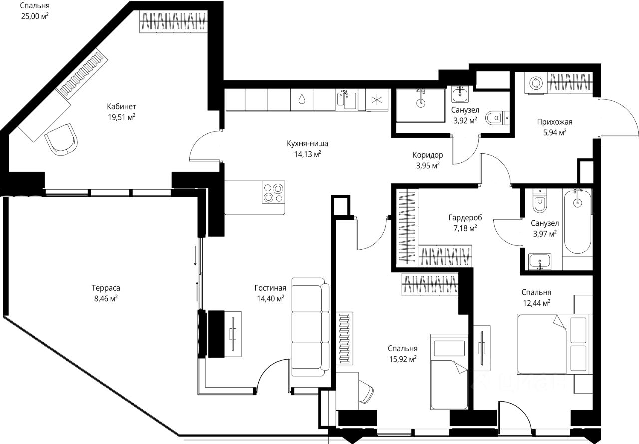 В продаже квартира площадью 109.82 м² без отделки на 9 этаже 55 этажного дома. Квартира расположена в корпусе Anna.