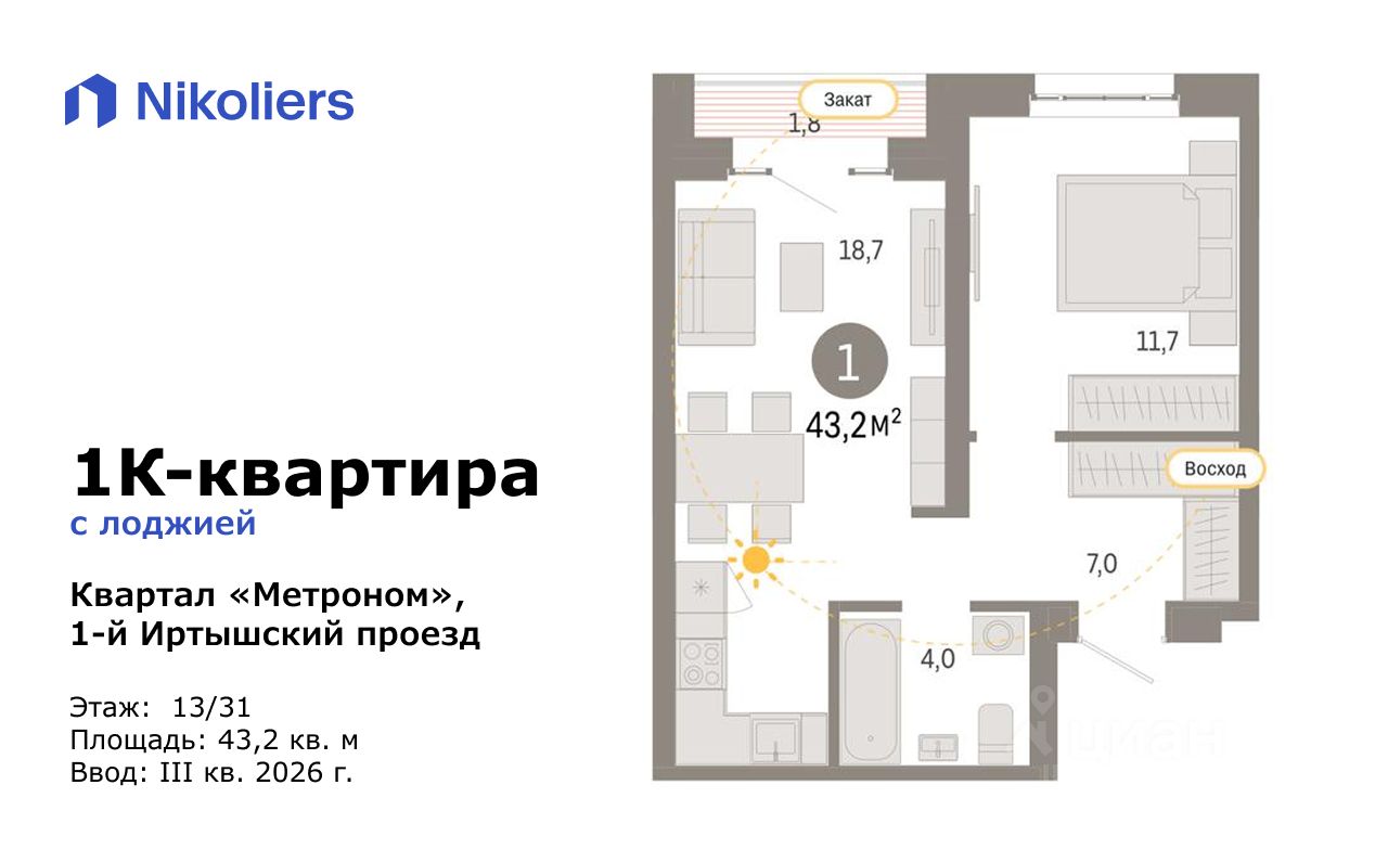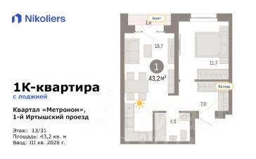1-комнатная квартира с кухней-гостиной и лоджией в жилом квартале Метроном.