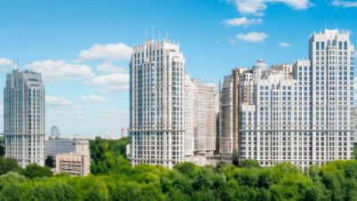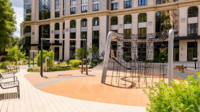 Главное о доме. "Городские резиденции Spires" стоят у Кутузовского проспекта и долины реки Сетунь — в окнах зелень и длинная линия горизонта. Архитектура цитирует ар-деко: ступенчатые силуэты башен, светлый камень, вертикали и крупное остекление. Во входных группах — натуральный камень, латунные акценты, высокий потолок, стойки ресепшн и мягкие зоны для встреч. На стилобате устроили дворы без машин с маршрутами для прогулок, детскими и спортивными площадками. На верхних уровнях встречаются открытые террасы. Первый этаж заняли кафе и повседневные сервисы. Многоуровневый паркинг связан с корпусами лифтами.