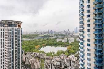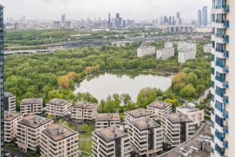 Квартира буквально залита естественным светом. Из окон открываются захватывающие виды на пруд, МГУ, Поклонную гору и деловой центр "Москва-Сити".