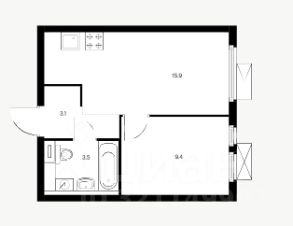 Планировка предусматривает большую кухню-гостиную, спальню, санузел и прихожуюс готовой нишей под встроенный шкаф.