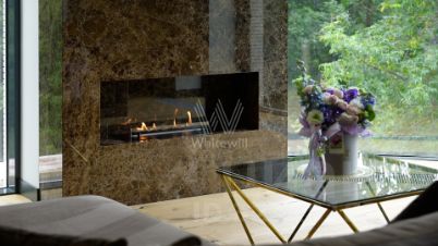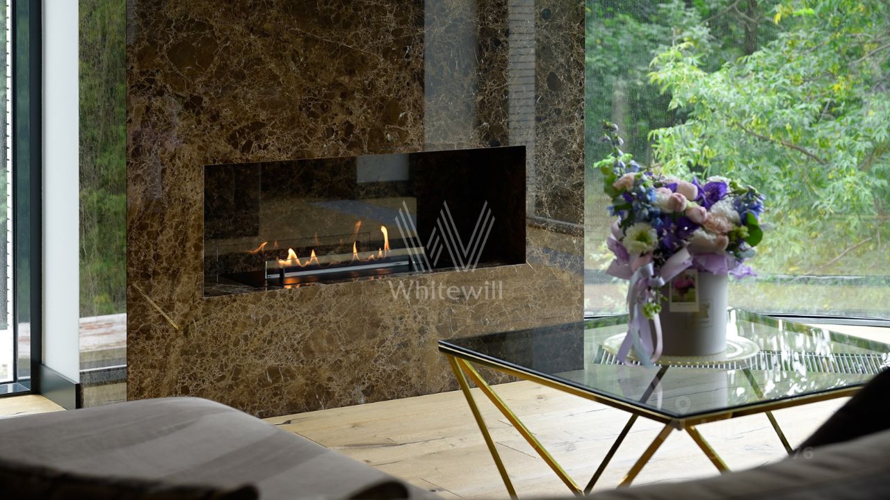 В прихожей, санузлах и на кухне установлена система теплый пол. Высота потолков — 3 метра. Функциональная планировка включает кухню-гостиную с камином, две спальни, два санузла, гардеробную и холл. Благодаря панорамному остеклению пространство наполнено естественным светом, открываются виды на природный заказник "Долина реки Сетунь" и Воробьевское шоссе.