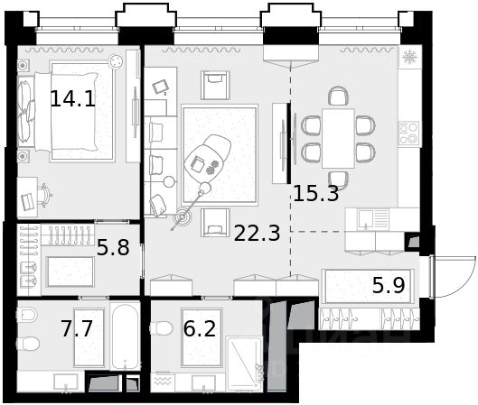 Двухкомнатная квартира площадью 77,30 кв. м. на 20 этаже нового дома премиум-класса Высотка на Жукова